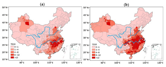 TD10 for 2050 ((a) RCP4.5; (b) RCP8.5).