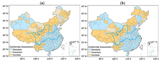 The conformity assessment for future mortality change in China (2020–2050) ((a) RCP4.5; (b) RCP8.5).
