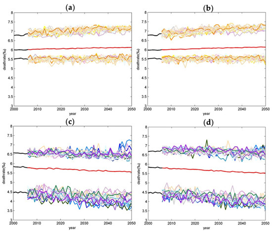 During 2000–2050, the maximum, minimum and average mortality for RDM and RIM under the two scenarios for each year are shown in Figure 8. The black line represents the maximum, average and minimum mortality for the period 2000–2005 and the red line represents the average mortality for the period 2006–2050. The colored lines indicate the maximum and minimum mortality for each model from 2006 to 2050.
