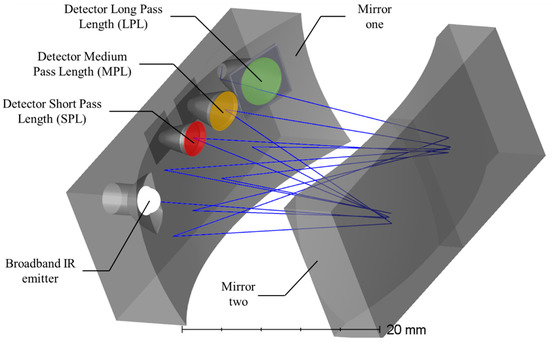 The K96 Sensor (Senseair, Sweden) relies on a novel patented optical concept, combining a multi-spectral and multi-optical path design in a single NDIR White-cell configuration [35,36]. The Sensor Core, referred to the combined optical cell and readout electronics, houses a conventional incandescent emitter source featuring a broadband emission spectrum, an essential prerequisite for the multi-gas sensing capabilities. Furthermore, three individual wavelength selective detectors are mounted to the optical cell, separated by a complete propagation cycle between the spherical mirrors. Consequently, each of the wavelength-selective detectors is associated with a dedicated propagation path length within the White cell configuration. Figure 2 illustrates the concept of the multi-pass NDIR sensor. The broadband IR emitter injects the IR radiation into the multi-pass cell, where the IR spectrum is propagating between the opposing mirrors until reaching the detector of the Short Pass Length (SPL). The wavelength-specific optical filter in front of the detector allows the transmission of only the gas-specific IR wavelength range, whereas the remaining IR spectrum is reflected and propagates further within the Medium Path Length (MPL) and Long Path Length (LPL), respectively. In doing so, three separated NDIR gas-sensing channels are realized with varying optical pathlengths i.e., the Short Path Length with 24 cm, the Medium Path Length with 36cm, and the Long Path Length with 48 cm, whereas the latter offers sub-ppm resolution.