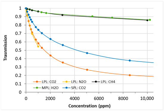 The results of exposing the sensor to different CO2, CH4, N2O, and H2O levels are summarized in Figure 4, where the transmission is plotted against the concentration in ppm. N2O and CH4 concentrations were measured on the LPL channel (48 cm optical path length),H2O on the MPL channel (36 cm optical path length), and CO2 was measured in multiple configurations on both LPL and SPL (24 cm optical path length) channels. All transmission curves can be modelled using the Lambert–Beer law and are sensor-specific based on the utilized optical path length, the wavelength-specific absorption coefficient of the gases, the bandwidth of the utilized filter, the wavelength-specific intensity of the emitter, and the specific sensitivity of the detector itself. Consequently, the transmission curve of CO2 measured on the LPL channel, which enables a longer propagation path length, shows a stronger signal decrease compared to the one measured on the SPL channel, whereas both use the same sensing wavelength band at about 4.3 µm. N2O and CO2 measured on the LPL channel show similar shape of the transmission curve in the 0-1000 ppm range. CH4, measured around 3.3 µm, and H2O, measured around 2.6 µm, reveal also a rather comparable transmission curve, but with a slighter signal decrease at increasing concentration. These results give a first indication of the expected relative sensitivity of the K96 for the different gas species measured with the three NDIR channels.