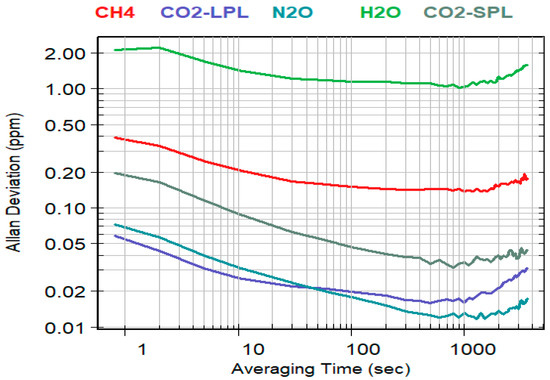 Allan deviation log plots as derived experimentally for CO2 (measured in both LPL and SPL channels), H2O (MPL channel), and for CH4 and N2O (LPL channel) by measuring a dry ‘zero gas’ (Nitrogen) over a 60 h period in stable lab conditions (temperature kept constant at 20 °C).