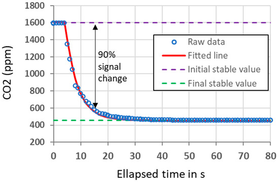 CO2 measured by one K96 sensor during the ‘fall’ response time experiment. At t = 0 s, the exposition chamber was lifted and the sensor, previously flushed with a high CO2 concentration from a cylinder, became exposed to room air.