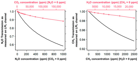 During our experiments, we identified two cross-sensitivity dependencies between the target gases, firstly between CO2 and N2O and secondly between H2O and CH4. Figure 7 shows on the left panel the N2O transmission signal measured on the LPL channel as the function of varying N2O concentrations in a Nitrogen mixture (black curve), and as the function of varying CO2 concentrations in a Nitrogen mixture (red curve). The CO2 influence on the measured N2O signal is clearly visible and not negligible for environments with very high CO2 levels. Indeed, a 15%v CO2 concentration will cause a N2O transmission loss of about 10%, which will correspond roughly to a +120 ppm N2O bias in a N2O free sample. The cross-sensitivity between H2O and CH4 is of higher magnitude, considering the overall low CH4 transmission signal measured on the LPL channel in the 0–2500 ppm CH4 range. As shown in Figure 7 (right panel), a 2.2%v H2O concentration (which corresponds to, for instance, 70% RH at 25 °C) in a CH4 free sample will cause a bias of about +300 ppm in the reported CH4 value.