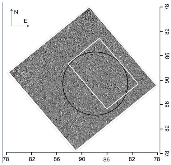 Photometric model CCD camera frame oriented to the cardinal points. The elevation angles are plotted along the axes (zenith is 90°). The black circle marks the 557.7 nm photometer channel FOV. The white rectangle is the region with the greatest response to pumping during the layer evolution.