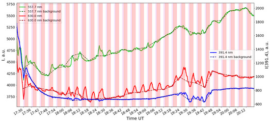 Figure 2 shows time series for the nm and 630 nm emission intensity recorded by the photometric suite on 5 September 2021 during the whole time of measurements.