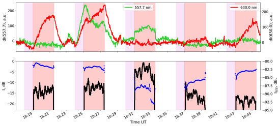 Upper panel: a fragment of data presented in Figure 3. Variations in the emissions intensity at nm and 630.0 nm (upper panel) from the photometer data (integration time 1 s). Lower panel: the ionospherically reflected PW signal (black) and SEE intensity averaged over the frequency range kHz (blue).