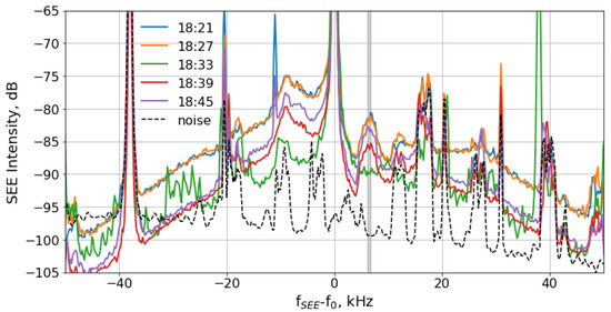 In addition to a zoomed fragment of the photometer data presented in Figure 3 (upper panel) for green (557.7 nm) and red (630 nm) lines, the ionospherically reflected PW signal and SEE intensity averaged over the frequency range kHz are shown in the lower panel of the Figure 4. This range belongs to the prominent SEE spectral feature, so-called Upshifted Maximum (see e.g., [42]). The whole SEE spectra registered at two minutes after the continuous pumping was switched on and averaged over 1 s for 5 successive pumping cycles, as shown in Figure 5. Note that at some frequencies, the SEE spectra are contaminated by interference from radio stations, which is illustrated by the “noise’’ line (dashed) in the Figure 5. This line corresponds to the spectrum registered during the pause in the PW radiation. Particularly, this concerns the frequency range kHz, where the most prominent SEE spectral feature, the Downshifted Maximum, exists. This is why we have chosen the frequency range kHz, which belongs to other prominent SEE spectral features, the Upshifted Maximum, for Figure 4, which is interference free. This range is highlighted by gray in Figure 5. From Figure 4 (lower panel) and Figure 5, it is seen that the reflected PW signal is stronger (by ∼10–15 dB), while the SEE is weaker by ∼5–10 dB during the cycle with continuous pumping at 18:31–18:33:30 UT rather than during other cycles. A strong decrease of the reflected PW signal during continuous pumping (so-called anomalous absorption), the SEE generation, as well as the red line emission enhancement are known to be related to the processes occurring near the reflection altitude of the PW in the F-region where plasma (Langmuir and/or upper hybrid) waves are effectively excited by the pump wave (e.g., [42]). Therefore, it is confirmed that during this cycle, the degradation of the F-region-related phenomena (anomalous absorption, SEE generation and 630 nm intensity enhancement) are related to blocking of the upper layers from the PW by sporadic E while the HF-induced 557.7 nm line emission generation occurs in the .