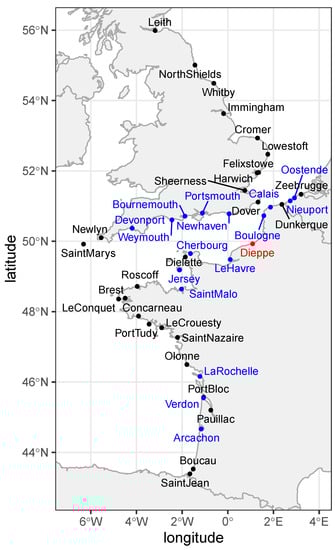 The S time series was extracted from the sea level measured by a tide gauge located in Dieppe, at 49.92917° N 1.08449° E. The skew surge is defined as the difference between the maximal observed sea level and the predicted astronomical high tide, resulting in an approximately 12 h and 25 min time step. Since this S time series had significant gaps in measurements, regional information from neighboring tide gauges was used for imputation. The extremogram approach was used to define a region of neighboring tide gauges centered on the target site Dieppe with a proportion of common extreme events above a given threshold. For this purpose, extreme events were defined as observations above the quantile [], and the proportion threshold of common events was chosen as 0.3 [], meaning neighbor stations included in the region had at least 30% of extreme events common with Dieppe (Figure 1). Once this region had been defined, its neighbor stations’ S time series were used to impute Dieppe’s one with a multiple linear regression. The spatial extremogram method for regionalization applied to S is presented in detail in Hamdi et al. [] and Andreevsky et al. []. The daily maximum S was then computed and used for the extreme values analysis.