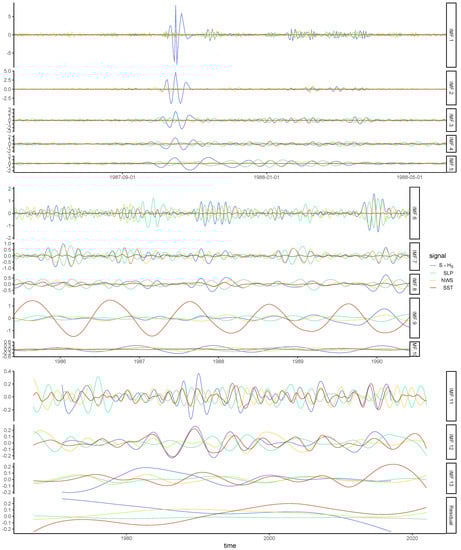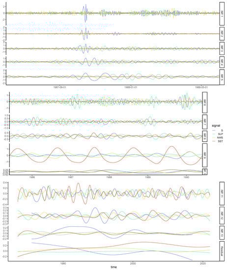 The relationship between the selected covariate time series and their corresponding variables was then analyzed for different timescales by complete ensemble empirical mode decomposition with adaptive noise (CEEMDAN) [] using the R package Rlibeemd (v. 1.4.2) []. This signal decomposition method is used to avoid spurious association with covariates that would only have a seasonal frequency in common with the variables (Figure 2), which would imply no relevant relationship. CEEMDAN is a modified version of ensemble empirical mode decomposition (EEMD), a widely used method developed by Wu and Huang []. The signal is decomposed iteratively into several intrinsic mode functions (IMFs) describing its different time-scales of variation of and a final residual that is considered to be the overall trend []. EEMD is itself a modified version of empirical mode decomposition that corrects the mode-mixing phenomenon when a given physical frequency is separated into several IMFs, but it introduced new issues, such as an unreliable number of IMFs produced and inexact reconstruction of the original signal, both caused by the random part of the algorithm []. The modifications of the CEEMDAN algorithm correct the issues of the EEMD while also producing a lower number of IMFs and a clearer separation of the frequency contained within the signal between signals, allowing better interpretability of their physical meaning. We compared the IMFs of the decomposed signal for each combination of variable and covariate to access their co-oscillations at different time scales. For the SLP, NWS and SST time series extracted from the field datasets to be good candidates as covariates for S, HS or S × HS, it would require them to have noticeable co-oscillations at different time scales, including those of higher or lower frequency than the seasonal cycle.