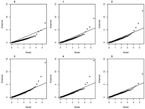 Quantile–quantile plots for the best NHPP model for S at each step of the mixed selection with a constant shape parameter (i.e., Models 0 to 5 of Table 1).