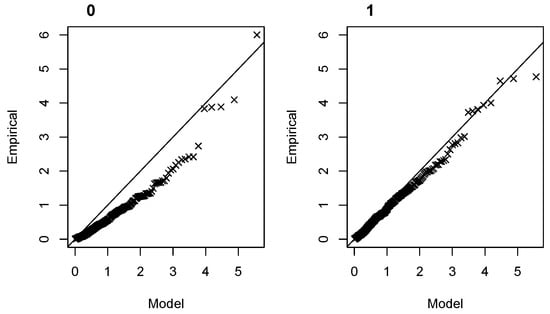For HS, the final model obtained when is kept constant is Model 1 of Table 2, with only a positive dependency of on NWS. The quantile–quantile plots of the mixed selection for HS show that this addition of NWS for greatly improves the model compared to the stationary case (Figure 8). This Model 1 for HS has the advantage of being parsimonious, with only one covariate and four hyperparameters, which, by comparison, reinforces the suspicion that Model 5 for S with its eight hyperparameters could be a case of overfitting.
