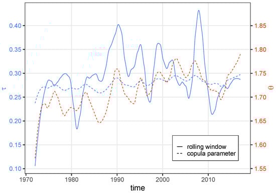 Rolling-window Kendall’s between S and HS (solid blue line), copula parameter (dashed red line) and the corresponding copula (dashed blue line). The rolling window has a duration of 365 days; thus, the first year of observation (1971) is not displayed. The time-series were smoothed with LOESS with a span of (i.e., a span of 5 years, which was selected for readability).