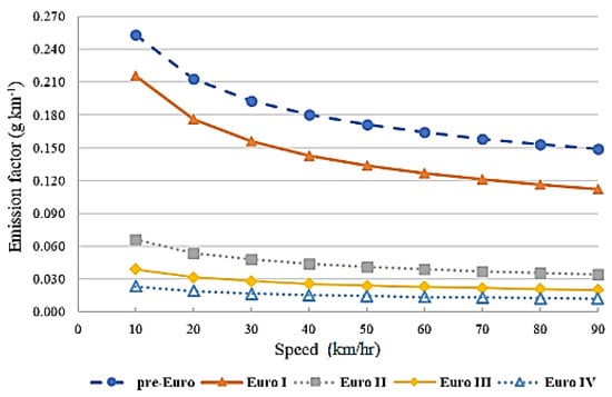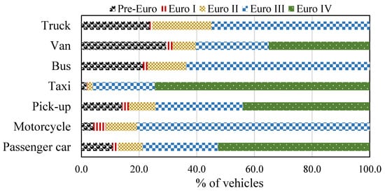 Emissions from vehicles depend on various factors, such as vehicle type, vehicle age, cumulative mileage and operating condition. Based on various characteristics of in-use vehicles in Bangkok, emission factors were classified according to vehicle type, emission standard and average speed on the road. Eight categories of vehicles were used, as discussed in Section 2.1. Vehicles were assumed to use either gasoline fuel (personal car, taxi, tuk-tuk and motorcycle) or diesel fuel (van, pickup, bus and truck). This assumption was valid for all vehicle types (more than 85% of vehicle registration numbers followed this fuel assumption) except for passenger cars with the fraction of gasoline to total vehicles at around 52% based on vehicle registration data for 2021 in Bangkok. Vehicle emission standards were classified as pre-Euro, Euro I, Euro II, Euro III and Euro IV [28], which are the vehicle emission standards implemented in Thailand.