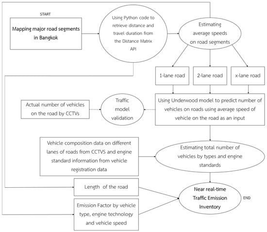 In this study, the Google map API, called the distance matrix API, which provides details of duration and distance between two points on any road section (starting node and ending node) from the Google map application [21], was used to estimate the average speed on different road sections in Bangkok. This near real-time traffic information from the Google API was used with a traffic model to predict traffic volume and to help in selecting suitable speed-related emission factors to develop a near real-time traffic emission inventory in Bangkok.