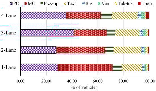 Information on fleet composition in Bangkok was collected by counting vehicle numbers on roads with different lanes using traffic video records. From Figure 3, it can be seen that the proportion of different vehicle types on roads having different numbers of lanes was not the same. However, the pattern was quite similar: PC and MC were found mostly on the roads, followed by taxi and pick-up. There were a larger proportion of large vehicles, i.e., buses and trucks, on roads with more lanes. In contrast, the proportion of motorcycles decreased as the number of lanes increased.