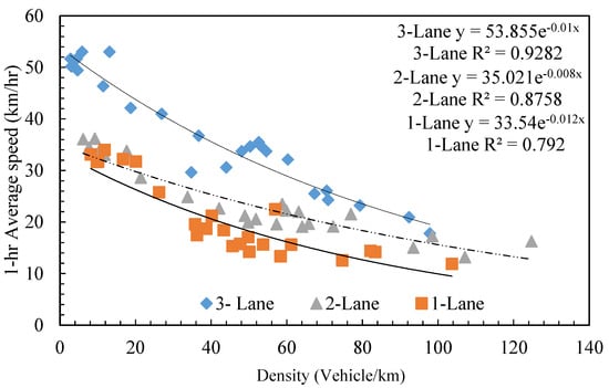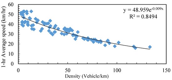 Traffic information from the distance matrix API was collected for 24 h in February 2019 and was used to estimate traffic density on the road. The traffic density and speed on the same road were plotted together to determine the relationship between both variables. Traffic models were then developed for roads with a different number of lanes. Figure 5 shows traffic models developed for different numbers of lanes. The traffic model for a three-lane road was selected to represent the main traffic model. It was used with the lane adjustment factor to estimate the traffic volume for different numbers of traffic lanes. Figure 6 shows the speed and density plotted with additional data reflecting a revised relationship between the 1-hr average speed and density. The data used for Figure 6 includes data on speed from different traffic directions on the same road (inbound and outbound) resulting in a slightly weaker relationship (R2) than when using data from one traffic direction alone. Greater fluctuation in average speed was observed at low vehicle density, consistent with the observations of Yu et al. [30]. Therefore, errors in prediction of traffic volume based on the traffic model could increase at high speed when vehicle density is low. The results showed that the average traffic volume was equal to 298 vehicles/hr (based on the actual number of vehicles obtained from CCTV recording during the night) when the average speed on the road was equal to or higher than 46 km/hr.