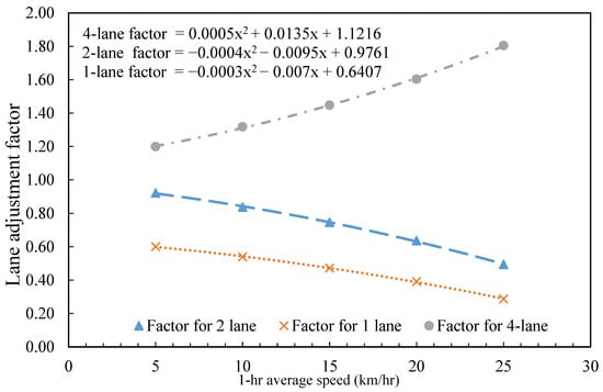 Next, lane adjustment factors, which were used to adjust the traffic volume based on the number of lanes, were developed. A three-lane road was used as the default number of lanes and the volume of different vehicle types was converted to the volume of passenger car equivalents using the passenger car unit (PCU). Then, the acquired PCU was divided by the traffic volume of the three-lane road to estimate the lane adjustment factor. The relationships between lane adjustment factors and speeds were developed for each number of lanes on the road.