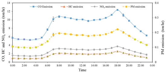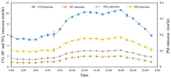 Diurnal distribution of traffic emissions in Bangkok during weekdays.