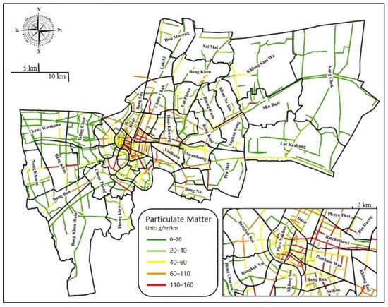 The traffic emissions on 2860 km of the main roads in Bangkok were automatically calculated by retrieving the traffic data from the distance traffic API and the Python code every 15 min. The main roads are the public roads that connect the province with the districts and sub-districts. The total traffic emissions were calculated and extrapolated to a total road length of 5400 km, including both the main and small local roads in Bangkok [29]. The spatial and temporal distribution of emissions were represented by plotting all road links in ArcGIS.