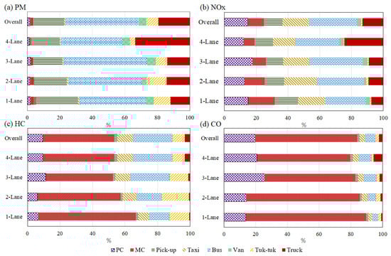 From Figure 11, it can be seen that the number of lanes directly affected vehicle composition on the road and, thus, traffic emissions. The proportion of emissions from small vehicles, such as motorcycles and passenger cars increased as the number of lanes reduced. Moreover, the major sources of CO and HC were from motorcycles, which contributed 64% and 44% of total traffic emissions, respectively. Buses were the major source of NOx and PM, contributing 30% and 45% of total traffic emissions, respectively.