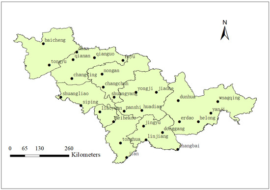 The data used in this study mainly come from “China Meteorological Data Service Center” (http://data.cma.cn, accessed on 30 December 2021). The statistical analysis data used in this study are the climatic data from 29 surface meteorological observation stations in Jilin Province from 1980 to 2019, and include the monthly average temperature, monthly average maximum temperature, monthly average minimum temperature, monthly average relative humidity, and monthly average wind speed. The test analysis data are the hourly surface observations data from Yongji station and Donggang station on 8 January 2022. The distribution of the 29 stations is shown in Figure 1.