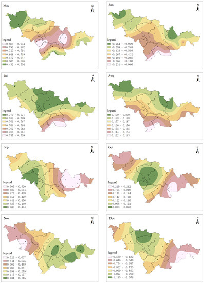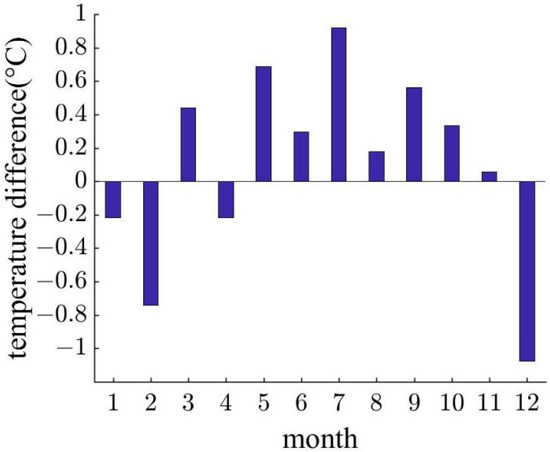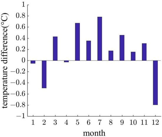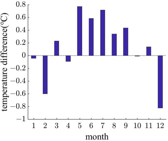 Figure 2 shows the temperature differences in the monthly average temperature between 2010–2019 and 1980–2009 in Jilin Province, China. According to the figure, the temperature differences in January, February, April, and December are negative, and those in March, May, June, July, August, September, October, and November are positive. The most significant differences are in July and December, exceeding +0.8 °C and −0.8 °C, respectively. Figure 3 and Figure 4, respectively, show the temperature differences of the monthly average maximum temperature and monthly average minimum temperature in Jilin Province between 2010–2019 and 1980–2009. Their change trends are roughly the same as the trend of the monthly average temperature. As shown in Figure 3, the extreme values of the average maximum temperature change more significantly, exceeding +1 °C and −1 °C, respectively. The average minimum temperature in October in the last 10 years is also lower than that in the past 30 years. The above results show that the climate of Jilin Province has become hotter in summer and colder in winter in the past 10 years.