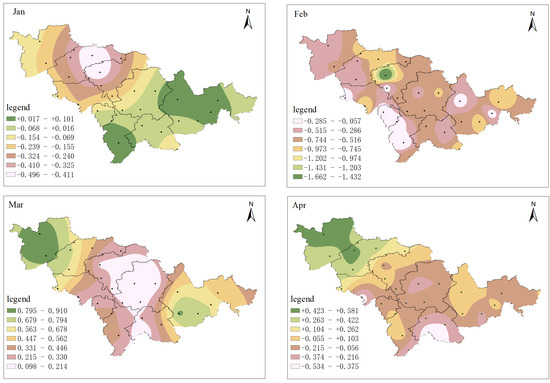 Figure 5 shows the spatial variation of monthly average temperature difference between 2010–2019 and 1980–2009 in Jilin Province. In Jilin Province, spring, summer, autumn and winter are usually from March to May, June to August, September to November, and December to February of the next year, respectively. As shown in Figure 5, the temperature rise in the central area of Jilin Province is smaller than that in the eastern and western areas in spring and autumn. In addition, in the last 10 years, the temperature rise in spring and autumn in the eastern and western areas is more evident than that in the central area; this is especially true for the maximum temperature rise in spring, at 0.9 °C. In summer, the range of temperature rises in the eastern and southeastern mountainous areas of Jilin Province is smaller than that in the central and western areas, and the places with evident temperature rises are in the central and western areas. In winter, the cooling ranges in the eastern and southeastern mountainous areas of Jilin Province are also weaker than those in the central and western areas. The central and western areas of Jilin Province are high-value cooling areas. According to the comprehensive analysis, the ranges of temperature rise and fall in the various areas of Jilin Province are unevenly distributed. The temperature rises and falls in the eastern and southeastern mountainous areas are weaker than those in other areas, whereas the central and western areas show a trend of bipolar strengthening, with a large range of warming and evident cooling.