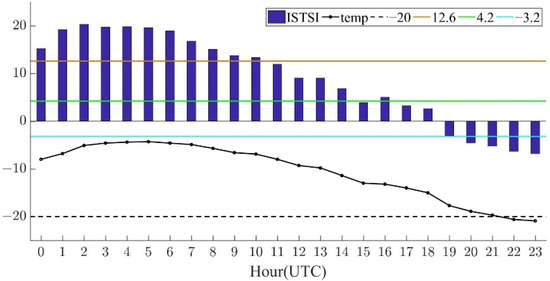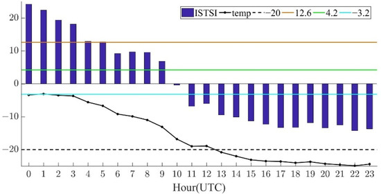 The 24 h change in temperature and ISTSI at Yongji station on 8 January 2022 (the unit of temperature is °C).