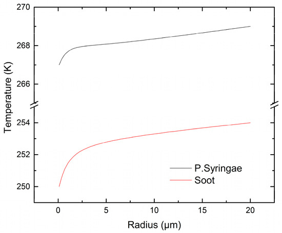 Figure 2 shows the combined conditions occurring among the radius of the pre-existing particle and temperature for IN activation. The simulations were performed for soot particles (θ = 48°; mean size range: 40 nm; [30]) and P. syringae bacteria (θ = 20°; mean size range: 5.8–22.8 μm; [9]). Activation of P. syringae occurs at higher temperatures compared to soot particles, arising from the lower contact angle values. The good IN nucleation potential of Pseudomonas syringae has been reported in several other studies [7,8]. With decreasing ambient temperature, the probability of IN activation increases due to the lower required energy for the formation of the critical clusters, and therefore IN formation occurs at a smaller particle radius.