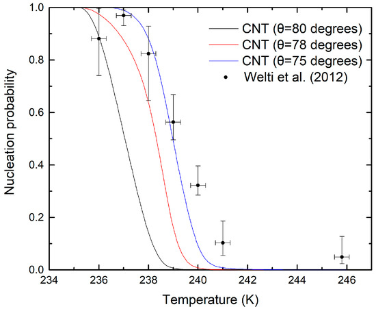 A comparison between IN CNT and the experimental data of Welti et al. [31] for kaolinite dust is presented in Figure 3. Different values of the contact angle were used for the CNT simulations. Higher probability values per surface area were observed at lower temperatures in qualitative agreement with the predictions of the nucleation theory. Using a single contact angle as the fitting parameter in the CNT model, it was possible to predict the general dependence of the nucleation probability versus temperature but there are considerable differences with the experimental results. In addition, the classical theory predicts a steeper descent in the nucleation probability versus temperature. The possibility that different particles have different adhesion potentials with ice embryos is proposed for more closely simulating the experimental results for different pre-existing particles [20] giving better agreement. However, fluctuations in temperature and relative humidity values in the atmosphere may compensate for this variability. In addition, it is very difficult to determine the possible distribution of contact angle values for the same particles, as well as the distribution of active sites. Furthermore, the data from Welti et al. [31] showed an increase in the nucleation probability with an increase in the particle radius of the pre-existing particles in qualitative agreement with the predictions of CNT.