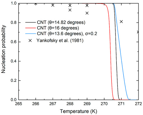 A further comparison with bacteria samples is presented in Figure 4, using two different contact angles. The contact angle of 14.82° was adopted from [6] to better fit the laboratory data of ice nucleation from single ice nucleation bacteria cells (Yellow pigmented isolate (strain M1) from Israel) measured by Yankofsky et al. [35,36]. The variability introduced using another contact angle (θ = 16°) is shown also, which results in a nucleation onset at a lower temperature. CNT using specific values for the contact angle was able to qualitatively reproduce the temperature dependence of the experimental data for bacteria cells, as shown in Figure 4, versus the nucleation probability, even though the differences in the actual nucleation rate are large. A simulation using a log-normal distribution of contact angles adopting the approach of Wang et al. [34] was also used (mean contact angle θ = 13.6° and standard deviation σ = 0.2). However, the deviations between the experimental data and CNT are large for temperatures above 271 K for this specific set of bacteria cells.