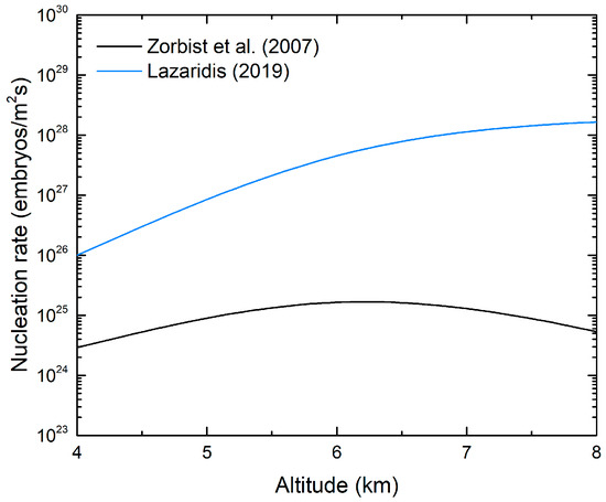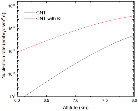 The effect of the surface tension correction on the nucleation rate at altitudes between 6 km and 8 km for the nucleation rate during immersion freezing (rp = 1 μm, θ = 60°)) is shown in Figure 9. The effect of the correction factor is prominent at altitudes up to 2 km, where IN activation occurs only in the case that the modified value of the surface tension was used with a predicted nucleation rate of 106 embryos m−2 s−1.