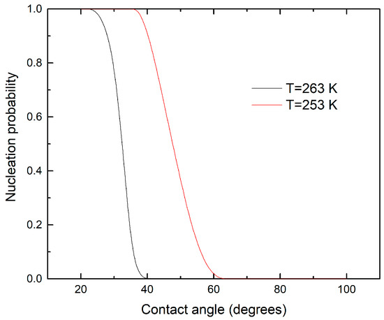 There is a high IN nucleation potential of P. syringae bacteria as reported in several studies in the literature [9], as well as a potential to act as cloud condensation nuclei (CCN) [38]. The possibility of heterogeneous IN of P. syringae was studied at different contact angle values, which remain the main factor controlling their activation at ambient temperatures occurring at the middle troposphere (T = 263 K and T = 253 K), as shown in Figure 6. These temperatures occur at altitudes between 0–4 km in the troposphere. The probability of IN activation is higher at lower contact angles and the nucleation potential increases with decreasing temperature. The activation of P. syringae is favorable at low contact angles for both temperatures, and at the lower temperature (T = 253 K) the activation occurs at contact angles close to 60°, which are higher than the representative contact value of 20° [9]. These results reveal the high activation potential of P. syringae bacteria in agreement with experimental studies on its high ice nucleation potential [9].