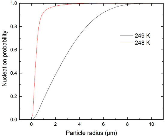 The surface area of the pre-existing particle for IN formation through immersion freezing was studied in the literature recognizing the effect of the total ice active surface area [2]. Beydoun et al. [39] calculated the total active surface area in their experiments as equal to 6 nm2 using CNT. The available surface area for ice nucleation is related to the nucleation probability, as shown in Figure 7. The simulations were performed at temperature conditions for a 6-km altitude (T = 248–249 K) with a contact angle θ = 55°. Higher activation occurs at lower temperatures and the increase in particle size results in an increase in the nucleation probability. In the atmosphere, an increase in the available surface area of specific particle types may result in a considerable change in ice nucleation probability. This sensitivity analysis is related to a potential temperature increase in the atmosphere through climate change. Even a temperature increase of one degree will result in considerable changes in the ice nucleation potential of the atmosphere, as shown in Figure 7.