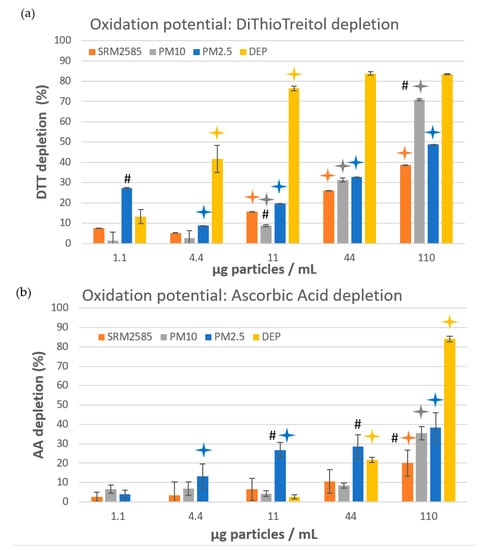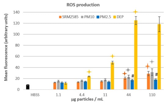 : significant difference between 2 consecutive doses (dose-effect relationship), p ≤ 0.05. #: for a given dose, significant difference between this sample and the two others (granulometric effect), p ≤ 0.05.