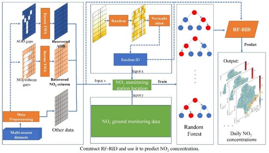 The main processes of the RF–RID for predicting the spatial distribution of near-surface NO2 concentrations included data preprocessing, remote sensing product gap filling (the 470 nm MAIAC AOD and OMI NO2 column), random ID (RID) establishment, random forest training, and NO2 spatial distribution. The flow chart is shown in Figure 2.