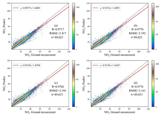 In addition, we selected four models (RF, RF–CID, RF–Ps, and RF–RID) to compare the spatial distribution of the predicted NO2 concentrations. Compared with the RF–RID model, RF lacks RID parameters. The RF–CID model replaces the RID parameter with a continuous pixel location ID (CID). The RF–Ps replace the RID parameters in RF–RID with the spatial distance variables in Wei et al. [50].