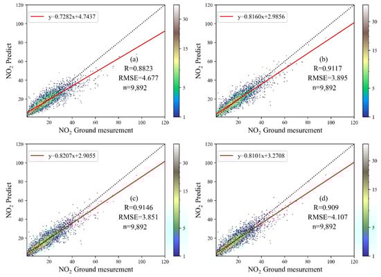 With the advancement of data and algorithms, the accuracy and resolution of NO2 concentration spatial distribution predictions have been improved. However, few studies reported the spatial distribution of NO2 concentrations in SWFJ in 2018. Accordingly, we selected the R2, RMSE, and resolution in five studies that were relatively close in recent years to compare with the results of this study (details are shown in Table 3). Young et al. [65] had a higher R than RF–RID but a lower NO2 spatial resolution. In addition, in the comparison of RMSE, the RF–RID model was better than GWR, LUR, and RF–STK. We used the TWS model to fill the gaps in the MAIAC AOD and OMI NO2 column products. These two parameters play a critical role in simulating NO2 with a resolution of 1 km near the ground. In addition, RID improves model CV and avoids local overfitting of simulations. Due to the significant differences between the comparative study and this study area, the study time and resolution were considered. The direct comparison of the indicators of these models is biased, and some indicators that are difficult to quantify need to be considered in the actual comparison process (such as the spatial distribution of predicted NO2). Nevertheless, the RF–RID model has significant advantages in comparing R, RMSE, and resolution. This finding further shows the stability and excellent performance of the RF–RID model.