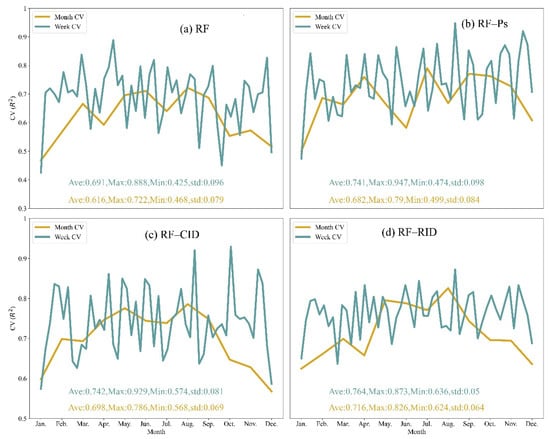 In addition, we tested the RF, RF–Ps, RF–CID and RF–RID models by selecting the data for one month and seven consecutive days (a week) as test samples (Figure 5).