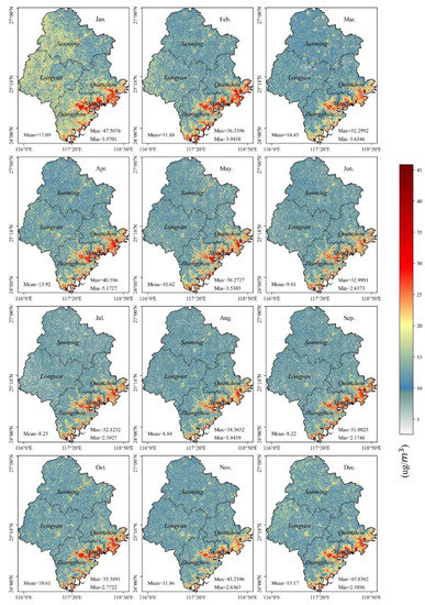 Optimizing the NO2 distribution prediction model is important because it can quickly and cost-effectively obtain the high-precision spatial distribution of air pollutants and compensate for errors caused by the insufficient and uneven distribution of sites [36]. Figure 7 and Figure 8 show that the average concentration of NO2 in each city of SWFJ is higher during spring (Jan. to Mar.) and winter (Oct. to Dec.) and lower in summer and autumn (Apr. to Sep.). High concentration areas are located in the coastal cities of Quanzhou, Zhangzhou, and Xiamen. At the same time, low values are distributed in the inland cities of Sanming and Longyan (Figure S4 in the supplementary material). The NO2 concentrations from high to low were as follows: Xiamen (17.2 µg/m3, 1/2 std = 2.8 µg/m3), Zhangzhou (13.6 µg/m3, 1/2 std = 2.4 µg/m3), Quanzhou (12.6 µg/m3, 1/2 std = 2.5 µg/m3), Longyan (10.6 µg/m3, 1/2 std = 1.4 µg/m3), and Sanming (10.2 µg/m3, 1/2 std = 1.3 µg/m3). Compared with statistical data from the air-pollutant-monitoring site in Figure S1 in the supplementary material, we found that the average concentration and standard deviation of the five cities in the spatial distribution of NO2 concentration were much smaller than the site statistics. In addition, the city rankings of the spatial distribution of NO2 concentration were different from the site statistics (the prediction result of the spatial distribution of NO2 concentration shows that Zhangzhou is second and Quanzhou is third; according to site statistics, Quanzhou is second, and Zhangzhou is third). The site monitoring of air pollutants was not statistically consistent with the RF–RID predictions, further confirming the importance of RF–RID. Furthermore, we counted the monthly average of Figure 7 and the monthly average of the OMI data in Figures S7 and S8, which can further determine the reliability of the near-surface NO2 simulation results.
