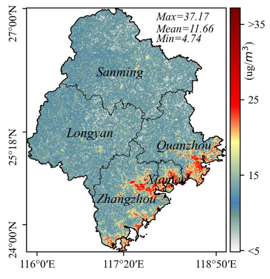 Since 2013, China has established a multi-scale air-pollutant-monitoring network. The network includes the nationwide Atmospheric Monitoring Network and the Fujian ecological environment cloud platform. The number and density of stations constructed in the regional atmospheric-monitoring network are higher than those on the national scale [54]. The study area selected in this paper includes five cities in southwestern Fujian (SWFJ) (115°51′–119°1′ E, 23°31′–27°6′ N). SWFJ includes Xiamen (1700 km2), Quanzhou (11,015 km2), Zhangzhou (12,600 km2), Longyan (19,028 km2), and Sanming (22,965 km2). The total administrative area of SWFJ exceeds 67,000 square kilometers, accounting for 54.3% of the total area of Fujian Province. The total population of SWFJ is 23.17 million, accounting for 59% of the total population of Fujian Province, and the urbanization rate is 67.1%. The topography of SWFJ is inland highland and coastal lowland and covers prosperous cities (industrial areas, road networks, residential areas) and mountainous environments (woodlands, lakes, rivers). Such a complex environment is conducive to testing the stability and universality of the NO2 concentration near-surface distribution model [55]. The location of the study area is shown in Figure 1.
