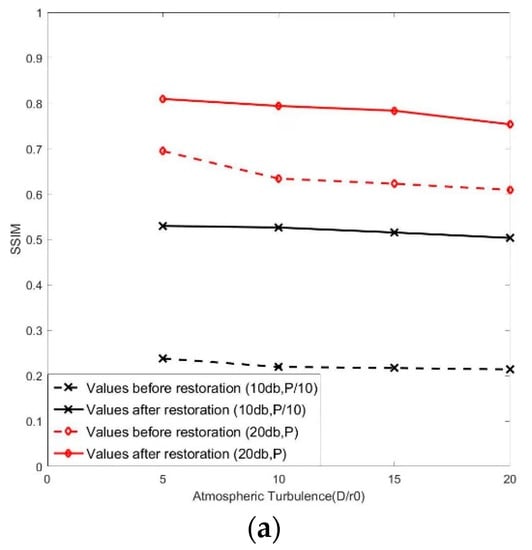 From Figure 4a, one can see that the change in turbulence strength has little effect on the SSIM whether the mixed noise is large (10 dB, P/10) or small (20 dB, P). When the mixed noise is 10 dB and P/10, the SSIM can reach 0.5 after restoration. Compared with the initial SSIM (0.2), the restored images’ quality is significantly improved. When the mixed noise is 20 dB and P (D/r0 = 10), the SSIM ranges from 0.63 (before restoration) to 0.79 (after restoration).