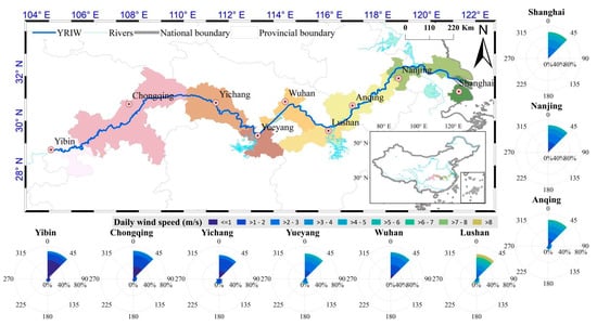 Location and wind–rose of the weather observing stations in the Yangtze River inland ports.