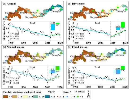 - The maximum wind speed in the YRIW shows a decline—recovery trend in the historical period, with Wuhan, Nanjing and Shanghai stations showing a slight increase except for the dry season.