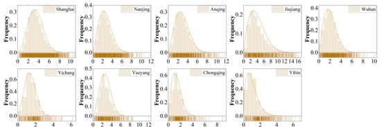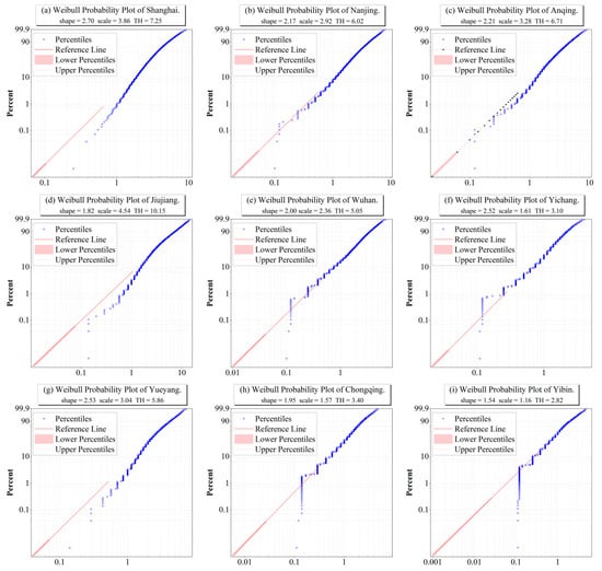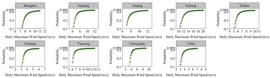 The daily maximum wind speed (Vmax) Weibull probability density distribution was further calculated and fitted for each port to obtain the wind speed curve (Figure 3), and the accuracy of the Weibull distribution function was examined using a quantified Q–Q plot (Figure 4). It was found that the high-frequency wind speed variation was mainly below 20 m·s−1; the raw frequency values of Vmax were much higher than the fitted values for all ports except Nanjing, Anqing, Jiujiang and Wuhan; and it was also found that the deviation between the two was larger in the wind speed interval below 10 m·s−1, indicating that the Weibull distribution results of these ports were susceptible to the influence of extreme wind speeds. The maximum wind speeds at Jiujiang port were closest to the Weibull distribution, and the other ports showed large deviations between the data set and the 45° line after exceeding a certain maximum wind speed. For example, the wind speed data of Shanghai port, Nanjing port and Anqing port in the interval above 20 m·s−1 do not obey the Weibull distribution, the wind speed data of Wuhan port and Yueyang port in the interval above 17 m·s−1 do not obey the Weibull distribution, and the wind speed data of Yichang port, Chongqing port and Yibin port in the interval above 10 m·s−1 do not obey the Weibull distribution. In general, there are extreme wind speeds in the maximum wind speed distribution of each port, which affects the smoothness characteristics of the Weibull distribution. Therefore, the sample data sets of extreme wind speeds for each port were extracted from the wind speed data that do not conform to the Weibull distribution and used to fit the GEV distribution, with the highest sample thresholds for Jiujiang port (10.15 m·s−1) and Shanghai port (7.25 m·s−1) and the lowest for Yibin port (2.82 m·s−1).