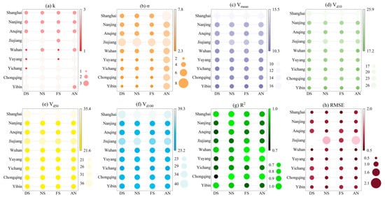 (a–h) Goodness-of-fit tests for the GEV distribution and 10/50/100 engineering design wind speeds (DS = dry season, NS = normal season, FS = flood season and AN = annual) for nine ports from 1979 to 2020.