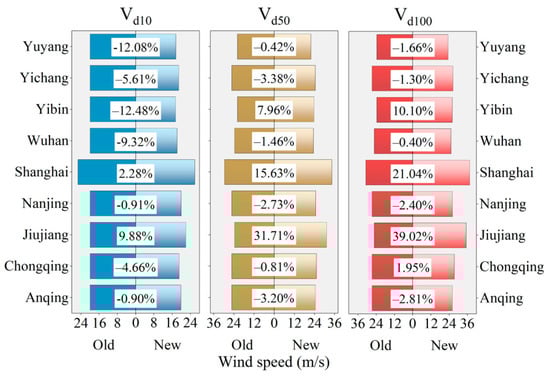 The above results show that Fréchet distribution can be widely used to simulate extreme wind speeds downstream of the YRIW, while the inverse Weibull distribution is mostly suitable for the upstream, and a mixed distribution of multiple GEV types exists in the midstream. The original data are the design wind pressure tables including major cities in China, from which the wind pressure values of the cities where the ports of different YRIWs are located were extracted (Figure 7) and converted to the design wind speed of the ports according to to port project design wind speed: Pd is the design wind pressure value (kN/m2), Vd is the design wind speed (m·s−1), c = 1600. Multiyear extreme wind speeds Vd10, Vd50 and Vd100 were used to compare with the recurrence period extreme wind speeds (Vd10old, Vd50old and Vd100old) of the Code.