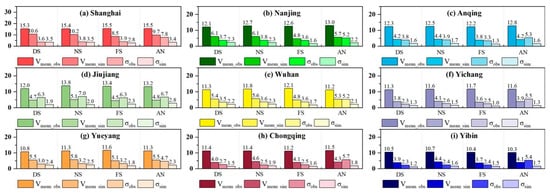The seasonal scale recurrence period projection shows that Vd10 (25.61–19.88 m·s−1), Vd50 (35.31–24.55 m·s−1) and Vd100 (39.23–26.53 m·s−1) are higher in the Shanghai–Wuhan port during the flood season than in other periods, and the high wind speed in the flood season is related to the strong convective weather caused by the prevailing southeastern summer wind, and the prevailing subtropical high pressure and the accompanying Vd10 (19.58–17.24 m·s−1), Vd50 (25.05–23.32 m·s−1) and Vd100 (27.60–26.70 m·s−1) are higher than other periods during the dry period in Chongqing–Yibin port because the winter temperature in Sichuan–Chongqing area is high and the stronger warm and humid air meets with the cold air from the north to cause windy weather. The Vd10, Vd50 and Vd100 of the remaining ports are significantly higher than their respective other periods, and the design wind speed Vd100 is mostly in the range of 25–27 m·s−1 except for Jiujiang (36.99 m·s−1), which is due to the higher average temperature in March–April and the high-pressure gradient compared with other seasons, resulting in higher wind speed.