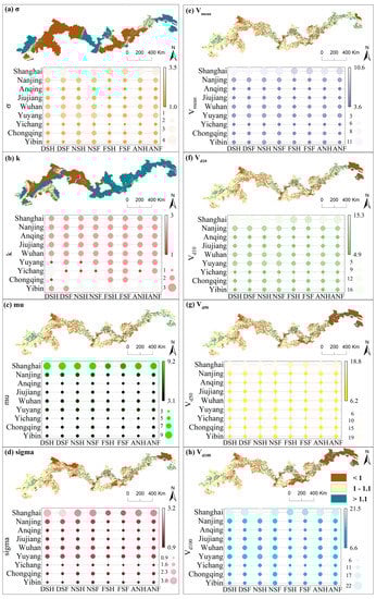 The analysis of the location and scale parameters of the GEV distribution shows that the characteristics of the mu high/low value distribution of the future Vmean are consistent with the historical period, and all cv are greater than 1 (Figure 9b,d). The mu high value centre of the historical period Vmean at the seasonal scale is similar to the annual scale distribution, and the spatial distribution of sigma at the annual/seasonal scale is basically similar, with Yichang port as the boundary, with the high value centre to the east and the low value centre to the west, all in line with the “The spatial distribution of sigma at annual/seasonal scales is similar, with the boundary at Yichang port, the high value centre in the east and the low value centre in the west. Nanjing has cv less than 1.0 in the annual and normal season, Shanghai has cv less than 1.0 in the normal season, and the rest of the sigma values show a large trend.